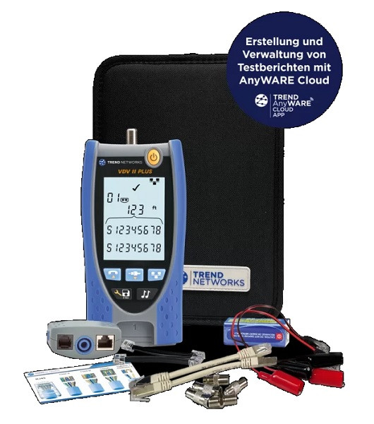 1 x Tester, 1 x Remoteadapter mit zwei Ports, 1 x Koaxial Remoteadapter, 1 x Alkali-Batterie, 1 x mehrsprachige Bedienungsanleitung, 2 x Kabel RJ45 auf Krokodilklemme (39 cm), 2 x geschirmtes Kabel RJ45 auf RJ45 (15 cm), 2 x Kabel RJ11/12 auf RJ11/12 (10 cm), 1 x Kabel F-Stecker auf F-Stecker (23 cm), 1 x F-81 Koaxialkupplung, 1 x Adapter BNC Buchse auf F-Stecker, 1 x Adapter BNC-Buchse auf F-Buchse, 1 x Adapter RCA-Buchse auf F-Stecker, 1 x Adapter RCA Buchse auf F-Buchse , 1 x Verdrahtungsübersicht im Brieftaschenformat, 1 x Tragetasche. Kupferkabeltester / Verifizierer VDV II Plus - Cloud-Connected, einfache Verdrahtungsprüfung mit Längenmessung/HUB-Blinken, AnyWARE Cloud-Konnektivität und Reporting über die AnyWARE App (Bluetooth-/Report-Funktion), für die Grundprüfung der Kupferverkabelung (einschließlich Koax- (F-Typ), 6-polige (RJ11/12) und 8-polige (RJ45) Steckverbinder), Verdrahtungsplan für Verdrahtungsfehler, Split-Pairs, Kurzschlüsse und Unterbrechungen, prüft UTP- und STP-Verkabelung, analoger Tongenerator, Spannungsschutz, unmittelbare Anzeige der Ergebnisse, kompatibel mit optionalen nummerierten Remoteadaptern, 2,9 inch/7,36 cm Display, hintergrundbeleuchteter Bildschirm, Kabellänge, Entfernung zur Unterbrechung, inklusive Zubehör (1 x Remoteadapter mit zwei Ports, 1 x Koaxial-Remoteadapter, 1 x Alkali-Batterie, 1 x mehrsprachige Bedienungsanleitung, 2 x Kabel RJ45 auf Krokodilklemme (39 cm), 2 x geschirmtes Kabel RJ45 auf RJ45 (15 cm), 2 x Kabel RJ11/12 auf RJ11/12 (10 cm), 1 x Kabel F-Stecker auf F-Stecker (23 cm), 1 x F-81 Koaxialkupplung, 1 x Adapter BNC-Buchse auf F-Stecker, 1 x Adapter BNC-Buchse auf F-Buchse, 1 x Verdrahtungsübersicht im Brieftaschenformat, 1 x Tragetasche)