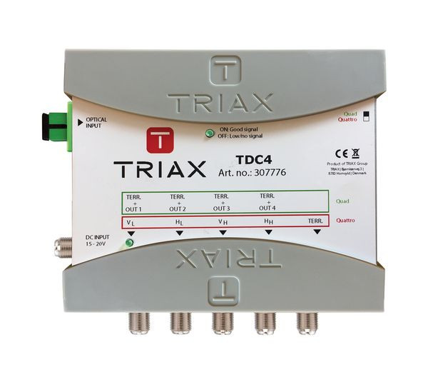 Der Wideband Rückumsetzer TDC4 wandelt das vom TSOT kommende optische Signal, auf ein elektrisches SAT-Signal zurück. Er unterstützt dabei die Rückumsetzung in dSCR Unicable, Legacy oder Quattro. Das terrestrische Signal vom TSOT wird ebenfalls auf die Ausgänge geschalten.