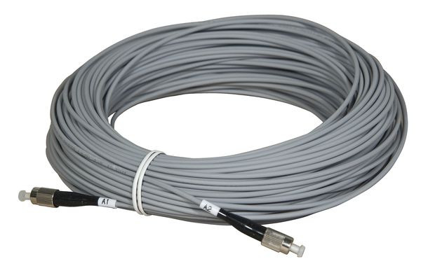 Optische Kabel, fertig konfektioniert. 50 m Kabellänge, geringe Dämpfung von 0,3 dB pro km, max. Biegeradius: 5 mm, UV-bestandig, fur Ausenverlegung geeignet, stahlarmierter Mantel als Schutz gegen mechanischen Druck/Zug, Kunststoff-Mantel grau LSHZ (rauchhemmend und halogenfrei), beidseitig konfektioniert mit Steckern FC/PC, geringe Brandlast im Vergleich zu Koax-Kabel, keine Brandauslosung durch Blitzschlag moglich, keine Beeinflussung durch elektrische oder elektromagnetische Felder, keine Erdung notwendig, wesentlich weniger Platzbedarf als Koaxialkabel, Monomode-Faser 9/125.