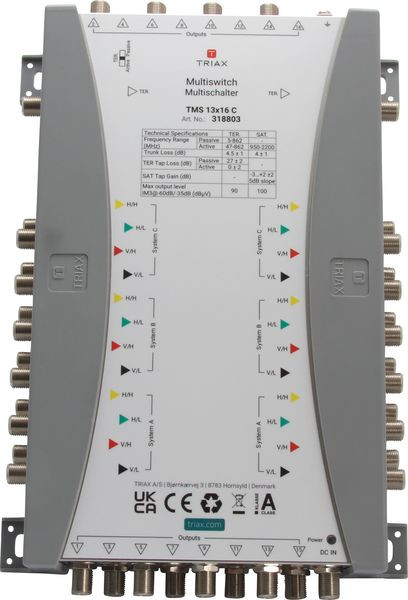 Kaskaden-Multischalter für drei Satellitenpositionen mit 13 Eingängen und 16 Ausgängen, geeignet für die Verteilung von Satelliten- und terrestrischen Signalen. Einfache und schnelle Installation durch farbliche Markierung aller Ein-/Ausgänge und einem kompakten, platzsparendem Gehäuse. Mit allen Kaskaden-Bausteinen der TMS13-Serie über Steckverbinder kombinierbar. Terrestrische Verteilung wahlweiße passiv oder aktiv.