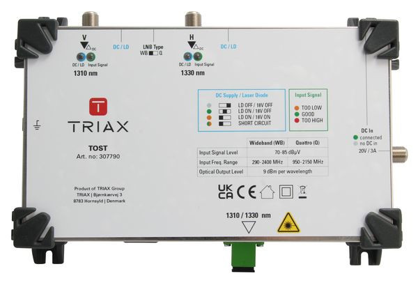 Der optische Sender TOST ermöglicht die optische Übertragung eines Satellitensignales über sehr große Enfernungen, für eine Vielzahl von Anschlüssen oder Gebäudeeinheiten. Rückwandlung des optischen Signals in Legacy-, dSCR- und SAT-Wideband möglich.