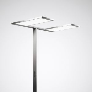 Standleuchte mit direktem und indirektem Lichtaustritt. Lichtaustrittsflächen direkt/indirekt separat steuerbar. Für die normgerechte Ausleuchtung von Doppel- und Vierfacharbeitsplätzen. Funkreichweite des Funkmoduls bei idealen Bedingungen: 15,0 m. Die Funkreichweite kann je nach Einflussfaktoren der Umgebung (z. B. Wände, Decken, Böden, Maschinen, Stahlträger, stromführende Leitungen) variieren. Durch ein zusätzliches Funkmodul, das als Repeater eingesetzt wird, kann die Funkreichweite erhöht werden. Ausführung mit integriertem Präsenz- und Tageslichtsensor. Sensor in Leuchtenfarbe. Mit integriertem Kommunikationsmodul. Zur Vernetzung und Ansteuerung von Nachbarleuchten. Inbetriebnahme und Steuerung per App. Kompatibel mit der LiveLink Workplace App. In Formensprache und lichttechnischen Eigenschaften harmoniert die Standleuchte mit Hänge- und Anbauleuchten sowie weiteren Standleuchten-Varianten im Projekt. Die Lieferung der Leuchte erfolgt zum Schutz der Einzelkomponenten in 4 Packstücken. Der Direktanteil der Leuchte bewirkt mit seiner breiten, leicht asymmetrischen Lichtstärkeverteilung eine sehr gleichmäßige Ausleuchtung der Schreibtischoberfläche. Der Indirektanteil mit lambertscher Lichtverteilung bewirkt eine optimale Raumausleuchtung. Mit asymmetrisch breit strahlender Lichtstärkeverteilung. Bildschirmarbeitsplatzgerecht gemäß EN 12464-1. Mit Tunable White Technologie zur Steuerung der Lichtfarbe mittels separatem Steuersystem (DT8). Bemessungslichtstrom 33000 lm, Bemessungsleistung 226 W, maximale Leuchten-Lichtausbeute 146 lm/W. Lichtfarbe , ähnlichste Farbtemperatur (CCT) , allgemeiner Farbwiedergabeindex (CRI) Ra > 90. Farborttoleranz (initial MacAdam) = 3 SDCM. Mittlere Bemessungslebensdauer L80 (tq 25 °C) = 100.000 h. Die Lichtquelle ist entsprechend der Ökodesign-Anforderungen (VO (EU) 2019/2020) austauschbar. Flimmern: Pst LM = 1,0 bei Volllast. Stroboskop-Effekt: SVM = 0,4 bei Volllast. Leuchtenkörper aus Aluminium-Strangpressprofil und Aluminiumdruckguss. Neigung des Leuchtenkopfes über zwei Madenschrauben in Längs- und Querrichtung justierbar. Flächenbündiger Leuchtenkopf aus Aluminium-Druckguss mit Designfugen. Oberfläche silbergrau beschichtet (ähnlich RAL 9006). Maße (L x B x H): x x . Standfuß in U-Form. Aus Stahl, pulverbeschichtet. Bedienfeld mit drei beleuchteten Tastern, Farbe schwarz. Bedienfeld in optimaler Höhe zur Anwendung mit höhenverstellbaren Schreibtischen. Schutzklasse (EN 61140): I, Schutzart (DIN EN 60529): IP20, Stoßfestigkeitsgrad nach IEC 62262: IK02, Prüftemperatur Glühdrahttest gemäß IEC 60695-2-11: 650 °C. Zulässige Umgebungstemperatur (ta): 25 °C Gewicht: 25,2 kg. Anschluß mittels flexibler Anschlussleitung 3 x 1 mm2 (Schutzkontaktstecker und Kaltgerätbuchse C14), Länge ca. 3000 mm. Schutzkontaktstecker kompatibel mit Steckdosen vom Typ E und Typ F. Steckerausführung: abgewinkelt. Die Anschlussleitung ist im Lieferumfang enthalten. Kaltgerätebuchse vorne am Leuchtenprofil für eine direkte Leitungsführung unter den Schreibtisch. Mit elektronischem Betriebsgerät, dimmbar (integriert). Das Betriebsgerät ist entsprechend der Ökodesign-Anforderungen (VO (EU) 2019/2020) austauschbar. Das Produkt erfüllt die grundlegenden Anforderungen der anwendbaren EU-Richtlinien und des Produktsicherheitsgesetzes und trägt die CE-Kennzeichnung. Leuchte 10 Jahre, Ersatzteile (LED-Modul, Betriebsgerät, optisches System) 15 Jahre nach Rechnungsdatum unter Vorbehalt vertretbarer Änderungen, die dem Fortschritt dienen, verfügbar.