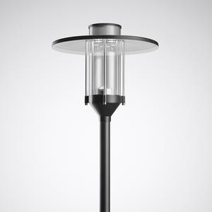 Dekorative LED-Oberlicht-Laterne für Mastaufsatzmontage.? Mit intelligentem Label zum schnellen Aufrufen von Leuchten-Informationen mittels QR-Code. Mit autarker Leistungsreduzierung über integrierte Auswerteelektronik. Reduzierung des Leuchtenlichtstroms auf 50 % für einen Zeitraum von 7 Stunden (-2h/+5h), verteilt um einen täglich neu bestimmten Mittelpunkt der Einschaltdauer. Mastzopf Ø 76 mm. Mittels separat zu bestellender Reduzierstücke auch zur Montage an Masten mit Zopf Ø 60 mm geeignet. Passender Mast auf Anfrage. Optisches System in Multi-Lens-Technologie (MLT) ausgeführt. Leuchtenoptik bestehend aus hocheffizienten, UV- und temperaturbeständigen Linsensystemen. Mit rotationssymmetrisch breit strahlender Lichtstärkeverteilung. Der nachträgliche Einbau einer rückseitigen / seitlichen Abschirmung ist als separat zu bestellendes Zubehör möglich. Leuchtenlichtstrom und Lichtfarbe fest eingestellt, mit Lichtstromkonstanthaltung am Ende der Lebensdauer (CLO). LED-System bestehend aus 4 LED-Modulen. Bemessungslichtstrom 3800 lm, Bemessungsleistung 34 W, maximale Leuchten-Lichtausbeute 112 lm/W. Lichtfarbe warmweiß, ähnlichste Farbtemperatur (CCT) 3000 K, Auf Anfrage auch in Tunable White Ausführung (2200 K - 4000 K) erhältlich. allgemeiner Farbwiedergabeindex (CRI) Ra > 70. Farborttoleranz (initial MacAdam) = 5 SDCM. Weitere LED-Lichtfarben auf Anfrage verfügbar. Mittlere Bemessungslebensdauer LCLO (tq 25 °C) = 100.000 h. Die Lichtquelle ist entsprechend der Ökodesign-Anforderungen (VO (EU) 2019/2020) austauschbar. Ausführungen mit 3-Stufen-Schalter zur Einstellung unterschiedlicher Lichtströme auf Anfrage. Flimmern: Pst LM = 1,0 bei Volllast. Leuchtenkörper aus Aluminium-Druckguss, Leuchtendach aus korrosionsbeständigem Aluminium, hochwetterfest pulverbeschichtet. Farbe schwarz (ähnlich RAL 9005). Seewetter geeignete Beschichtung auf Anfrage. Leuchtendach innen weiß pulverbeschichtet. Abschlusszylinder aus hochschlagzähem PMMA, klar. Leuchtenabdeckung in selbstarretierende Service-Position hochschiebbar. Mast auf Anfrage erhältlich. Schutzklasse (EN 61140): II, Schutzart (DIN EN 60529): IP23, Schutzart Lampenraum: IP65. Stoßfestigkeitsgrad nach IEC 62262: IK04. Zulässige Umgebungstemperatur (ta): 25 °C Windangriffsfläche fw 0,470 m2. Gewicht: 11,0 kg. Werkseitig angeschlossene Anschlussleitung. Länge der Anschlussleitung: 6,0 m. Mit elektronischem Betriebsgerät, schaltbar Das Betriebsgerät ist entsprechend der Ökodesign-Anforderungen (VO (EU) 2019/2020) austauschbar. Mit angeschlossener, 6000 mm langer Zuleitung. Mit isoliertem Stützpunkt für den Erdleiter. Elektroblock mit allen elektrischen Komponenten werkzeuglos austauschbar. Stoßspannungsfestigkeit Differential Mode / Common Mode: 6 kV / 10 kV. Das Produkt erfüllt die grundlegenden Anforderungen der anwendbaren EU-Richtlinien und des Produktsicherheitsgesetzes und trägt die CE-Kennzeichnung. Zusätzlich ist die Leuchte durch eine unabhängige Prüfstelle ENEC-zertifiziert. Leuchte 10 Jahre, Ersatzteile (LED-Modul, Betriebsgerät, optisches System) 15 Jahre nach Rechnungsdatum unter Vorbehalt vertretbarer Änderungen, die dem Fortschritt dienen, verfügbar.