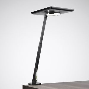 Innovative Tischleuchte mit direktem Lichtanteil für individuelle Arbeitsplatzausleuchtung und indirektem Lichtanteil für allgemeine Raumausleuchtung. Mit integriertem Lichtmanagement zur synchronen tages- und jahreszeitabhängigen Steuerung der Lichtfarbe (Circadian-Steuerung) beider Lichtaustrittsebenen. Manuelle Einstellung der Lichtfarbe und separates Schalten und Dimmen beider Lichtanteile durch 3 beleuchtete Bedienelemente. Mit Comfort-Ausstattung. Mit integriertem Steuergerät zur synchronen tages- und jahreszeitzeitabhängigen Steuerung der Lichtfarbe (Circadian-Steuerung) beider Lichtaustrittsebenen. Der Lichtstrom kann für beide Lichtaustritte separat geschaltet und gedimmt werden. Besonders geeignet für die Ausstattung moderner Büroumgebungen, speziell in Open Space Anwendungen und offenen Kommunikationszonen als Tischleuchte für alle Arten von festen und höhenverstellbaren Schreib-, Besprechungs- und Arbeitstischen. Für die anforderungsorientierte, den Arbeitsschutzbestimmungen entsprechende Beleuchtung auch im Bereich der Home Office Anwendungen. Auch geeignet für Arbeitsbereiche mit geringer Tageslichtversorgung. Mit Tischklemme zur Befestigung der Leuchte am Rand einer massiven, tragfähigen Oberfläche mit einer Materialstärke von 15 mm bis 50 mm und ca. 100 mm Klemmtiefe. Die Leuchte ist um 180° drehbar. Die Oberfläche des Befestigungsbereiches ist durch einen Gummipuffer geschützt. Triple Glare Control System (TGCS®) für einen blendungsreduzierten, symmetrisch strahlenden Indirektanteil mit begrenztem Ausstrahlwinkel. Mit klarer, hochkratzfester Acryl-Abschlußscheibe. Mit symmetrisch begrenzt breit strahlender Lichtstärkeverteilung. Blendungsbewertung nach UGR-Einstufung (EN 12464-1) < 19. Mit Tunable White Technologie zur Steuerung der Lichtfarbe mittels separatem Steuersystem (DT8). Bemessungslichtstrom 5580 lm, Bemessungsleistung 50 W, maximale Leuchten-Lichtausbeute 112 lm/W. Aufteilung des Leuchten-Lichtstroms Indirekt-/Direktanteil 90% / 10 %. Lichtfarbe Tunable White (warmweiß - tageslichtweiß), ähnlichste Farbtemperatur (CCT) Tunable White (2700 K - 6000 K), allgemeiner Farbwiedergabeindex (CRI) Ra > 80. Farborttoleranz (initial MacAdam) = 3 SDCM. Mittlere Bemessungslebensdauer L80 (tq 25 °C) = 50.000 h. Flimmern: Pst LM = 1,0 bei Volllast. Stroboskop-Effekt: SVM = 0,4 bei Volllast. Leuchtenkörper aus Aluminium-Druckguss. Oberfläche schwarz beschichtet (ähnlich RAL 9005). Bedienelemente verchromt. Maße des Leuchtenkopfes (L x B x H) 320 mm x 240 mm, Leuchtenhöhe (stufenlos einstellbar) 500 mm - 650 mm. Schutzklasse (EN 61140): II, Schutzart (DIN EN 60529): IP20, Stoßfestigkeitsgrad nach IEC 62262: IK02, Prüftemperatur Glühdrahttest gemäß IEC 60695-2-11: 650 °C. Zulässige Umgebungstemperatur (ta): 25 °C Gewicht: 3,2 kg. Steckernetzteil mit Anschlussleitung (3000 mm). Mit Euro-Anschluss-Stecker (Typ C, EN 50075). Mit elektronischem Betriebsgerät, dimmbar (integriert) Das Betriebsgerät ist entsprechend der Ökodesign-Anforderungen (VO (EU) 2019/2020) austauschbar. Mit USB-Anschlussbuchse im Leuchtenfuß zum Aufladen von mobilen Kommunikationsgeräten (4,9 V / 1 A). Das Produkt erfüllt die grundlegenden Anforderungen der anwendbaren EU-Richtlinien und des Produktsicherheitsgesetzes und trägt die CE-Kennzeichnung. Zusätzlich ist die Leuchte durch eine unabhängige Prüfstelle ENEC-zertifiziert. Leuchte 10 Jahre, Ersatzteil Betriebsgerät 15 Jahre nach Rechnungsdatum unter Vorbehalt vertretbarer Änderungen, die dem Fortschritt dienen, verfügbar. Ersatzteile LED-Modul und optisches System sind bauartbedingt nicht verfügbar.