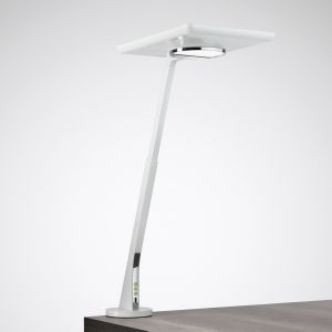 Innovative Tischleuchte mit direktem Lichtanteil für individuelle Arbeitsplatzausleuchtung und indirektem Lichtanteil für allgemeine Raumausleuchtung. Mit integriertem Lichtmanagement zur synchronen tages- und jahreszeitabhängigen Steuerung der Lichtfarbe (Circadian-Steuerung) beider Lichtaustrittsebenen. Die Bedienung der Beleuchtungsfunktionen erfolgt manuell durch 3 Bedienelemente sowie mittels Smartphone-App. Mit HF-Präsenzsensor, HCL-Steuerung und Smart-Single-Ausstattung. Die Leuchte verfügt über einen integrierten Tageslicht- und HF-Präsenzsensor mit Bewegungsrichtungserkennung. Mit integriertem Lichtmanagement zur synchronen tages- und jahreszeitabhängigen Steuerung der Lichtfarbe (Circadian-Steuerung) beider Lichtaustrittsebenen. Die Kommunikation zwischen Leuchte und Smartphone erfolgt mittels Bluetooth Low Energy v 5.0. Besonders geeignet für die Ausstattung moderner Büroumgebungen, speziell in Open Space Anwendungen und offenen Kommunikationszonen als Tischleuchte für alle Arten von festen und höhenverstellbaren Schreib-, Besprechungs- und Arbeitstischen. Für die anforderungsorientierte, den Arbeitsschutzbestimmungen entsprechende Beleuchtung auch im Bereich der Home Office Anwendungen. Auch geeignet für Arbeitsbereiche mit geringer Tageslichtversorgung. Mit Tischklemme zur Befestigung der Leuchte am Rand einer massiven, tragfähigen Oberfläche mit einer Materialstärke von 15 mm bis 50 mm und ca. 100 mm Klemmtiefe. Die Leuchte ist um 180° drehbar. Die Oberfläche des Befestigungsbereiches ist durch einen Gummipuffer geschützt. Triple Glare Control System (TGCS®) für einen blendungsreduzierten, symmetrisch strahlenden Indirektanteil mit begrenztem Ausstrahlwinkel. Mit klarer, hochkratzfester Acryl-Abschlußscheibe. Mit symmetrisch begrenzt breit strahlender Lichtstärkeverteilung. Blendungsbewertung nach UGR-Einstufung (EN 12464-1) < 19. Mit Tunable White Technologie zur Steuerung der Lichtfarbe mittels separatem Steuersystem (DT8). Bemessungslichtstrom 5580 lm, Bemessungsleistung 52 W, maximale Leuchten-Lichtausbeute 107 lm/W. Aufteilung des Leuchten-Lichtstroms Indirekt-/Direktanteil 90% / 10 %. Lichtfarbe Tunable White (warmweiß - tageslichtweiß), ähnlichste Farbtemperatur (CCT) Tunable White (2700 K - 6000 K), allgemeiner Farbwiedergabeindex (CRI) Ra > 80. Farborttoleranz (initial MacAdam) = 3 SDCM. Mittlere Bemessungslebensdauer L80 (tq 25 °C) = 50.000 h. Flimmern: Pst LM = 1,0 bei Volllast. Stroboskop-Effekt: SVM = 0,4 bei Volllast. Leuchtenkörper aus Aluminium-Druckguss. Oberfläche weiß beschichtet (ähnlich RAL 9016). Bedienelemente verchromt. Maße des Leuchtenkopfes (L x B x H) 320 mm x 240 mm, Leuchtenhöhe (stufenlos einstellbar) 500 mm - 650 mm. Schutzklasse (EN 61140): II, Schutzart (DIN EN 60529): IP20, Stoßfestigkeitsgrad nach IEC 62262: IK02, Prüftemperatur Glühdrahttest gemäß IEC 60695-2-11: 650 °C. Zulässige Umgebungstemperatur (ta): 25 °C Gewicht: 3,2 kg. Steckernetzteil mit Anschlussleitung (3000 mm). Mit Euro-Anschluss-Stecker (Typ C, EN 50075). Mit elektronischem Betriebsgerät, dimmbar (integriert) Das Betriebsgerät ist entsprechend der Ökodesign-Anforderungen (VO (EU) 2019/2020) austauschbar. Mit USB-Anschlussbuchse im Leuchtenfuß zum Aufladen von mobilen Kommunikationsgeräten (4,9 V / 1 A). Das Produkt erfüllt die grundlegenden Anforderungen der anwendbaren EU-Richtlinien und des Produktsicherheitsgesetzes und trägt die CE-Kennzeichnung. Zusätzlich ist die Leuchte durch eine unabhängige Prüfstelle ENEC-zertifiziert. Leuchte 10 Jahre, Ersatzteil Betriebsgerät 15 Jahre nach Rechnungsdatum unter Vorbehalt vertretbarer Änderungen, die dem Fortschritt dienen, verfügbar. Ersatzteile LED-Modul und optisches System sind bauartbedingt nicht verfügbar.