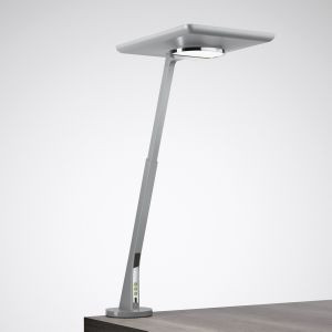 Innovative Tischleuchte mit direktem Lichtanteil für individuelle Arbeitsplatzausleuchtung und indirektem Lichtanteil für allgemeine Raumausleuchtung. Mit integriertem Lichtmanagement zur synchronen tages- und jahreszeitabhängigen Steuerung der Lichtfarbe (Circadian-Steuerung) beider Lichtaustrittsebenen. Die Bedienung der Beleuchtungsfunktionen erfolgt manuell durch 3 Bedienelemente sowie mittels Smartphone-App. Mit HF-Präsenzsensor, HCL-Steuerung und Smart-Single-Ausstattung. Die Leuchte verfügt über einen integrierten Tageslicht- und HF-Präsenzsensor mit Bewegungsrichtungserkennung. Mit integriertem Lichtmanagement zur synchronen tages- und jahreszeitabhängigen Steuerung der Lichtfarbe (Circadian-Steuerung) beider Lichtaustrittsebenen. Die Kommunikation zwischen Leuchte und Smartphone erfolgt mittels Bluetooth Low Energy v 5.0. Besonders geeignet für die Ausstattung moderner Büroumgebungen, speziell in Open Space Anwendungen und offenen Kommunikationszonen als Tischleuchte für alle Arten von festen und höhenverstellbaren Schreib-, Besprechungs- und Arbeitstischen. Für die anforderungsorientierte, den Arbeitsschutzbestimmungen entsprechende Beleuchtung auch im Bereich der Home Office Anwendungen. Auch geeignet für Arbeitsbereiche mit geringer Tageslichtversorgung. Mit Tischklemme zur Befestigung der Leuchte am Rand einer massiven, tragfähigen Oberfläche mit einer Materialstärke von 15 mm bis 50 mm und ca. 100 mm Klemmtiefe. Die Leuchte ist um 180° drehbar. Die Oberfläche des Befestigungsbereiches ist durch einen Gummipuffer geschützt. Triple Glare Control System (TGCS®) für einen blendungsreduzierten, symmetrisch strahlenden Indirektanteil mit begrenztem Ausstrahlwinkel. Mit klarer, hochkratzfester Acryl-Abschlußscheibe. Mit symmetrisch begrenzt breit strahlender Lichtstärkeverteilung. Blendungsbewertung nach UGR-Einstufung (EN 12464-1) < 19. Mit Tunable White Technologie zur Steuerung der Lichtfarbe mittels separatem Steuersystem (DT8). Bemessungslichtstrom 5580 lm, Bemessungsleistung 52 W, maximale Leuchten-Lichtausbeute 107 lm/W. Aufteilung des Leuchten-Lichtstroms Indirekt-/Direktanteil 90% / 10 %. Lichtfarbe Tunable White (warmweiß - tageslichtweiß), ähnlichste Farbtemperatur (CCT) Tunable White (2700 K - 6000 K), allgemeiner Farbwiedergabeindex (CRI) Ra > 80. Farborttoleranz (initial MacAdam) = 3 SDCM. Mittlere Bemessungslebensdauer L80 (tq 25 °C) = 50.000 h. Flimmern: Pst LM = 1,0 bei Volllast. Stroboskop-Effekt: SVM = 0,4 bei Volllast. Leuchtenkörper aus Aluminium-Druckguss. Oberfläche silbergrau beschichtet (ähnlich RAL 9006). Bedienelemente verchromt. Maße des Leuchtenkopfes (L x B x H) 320 mm x 240 mm, Leuchtenhöhe (stufenlos einstellbar) 500 mm - 650 mm. Schutzklasse (EN 61140): II, Schutzart (DIN EN 60529): IP20, Stoßfestigkeitsgrad nach IEC 62262: IK02, Prüftemperatur Glühdrahttest gemäß IEC 60695-2-11: 650 °C. Zulässige Umgebungstemperatur (ta): 25 °C Gewicht: 3,2 kg. Steckernetzteil mit Anschlussleitung (3000 mm). Mit Euro-Anschluss-Stecker (Typ C, EN 50075). Mit elektronischem Betriebsgerät, dimmbar (integriert) Das Betriebsgerät ist entsprechend der Ökodesign-Anforderungen (VO (EU) 2019/2020) austauschbar. Mit USB-Anschlussbuchse im Leuchtenfuß zum Aufladen von mobilen Kommunikationsgeräten (4,9 V / 1 A). Das Produkt erfüllt die grundlegenden Anforderungen der anwendbaren EU-Richtlinien und des Produktsicherheitsgesetzes und trägt die CE-Kennzeichnung. Zusätzlich ist die Leuchte durch eine unabhängige Prüfstelle ENEC-zertifiziert. Leuchte 10 Jahre, Ersatzteil Betriebsgerät 15 Jahre nach Rechnungsdatum unter Vorbehalt vertretbarer Änderungen, die dem Fortschritt dienen, verfügbar. Ersatzteile LED-Modul und optisches System sind bauartbedingt nicht verfügbar.