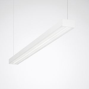 LED-Hängeleuchte für Einzel- oder Lichtbandanwendungen. Für abgehängte Montage. Als Einzelleuchte oder in Lichtbandanwendung. Optisches System mit PMMA-Linsentechnik. Abdeckscheibe aus transluzentem PMMA für hohe Entblendung und Effizienz. Mit symmetrisch begrenzt breit strahlender Lichtstärkeverteilung. Blendungsbewertung nach UGR-Einstufung (EN 12464-1) < 19. Bildschirmgerecht gemäß EN 12464-1 durch begrenzte Leuchtdichten L = 1500 cd/m2 für Ausstrahlungswinkel oberhalb 65° rundum. Leuchtenlichtstrom und Lichtfarbe fest eingestellt. Bemessungslichtstrom 6400 lm, Bemessungsleistung 43 W, maximale Leuchten-Lichtausbeute 149 lm/W. Lichtfarbe neutralweiß, ähnlichste Farbtemperatur (CCT) 4000 K, allgemeiner Farbwiedergabeindex (CRI) Ra > 80. Farborttoleranz (initial MacAdam) = 3 SDCM. Mittlere Bemessungslebensdauer L80 (tq 25 °C) = 50.000 h. Die Lichtquelle ist entsprechend der Ökodesign-Anforderungen (VO (EU) 2019/2020) austauschbar. Flimmern: Pst LM = 1,0 bei Volllast. Stroboskop-Effekt: SVM = 0,4 bei Volllast. Leuchtenkörper aus Stahlblech. Oberfläche weiß beschichtet (ähnlich RAL 9016). Maße (L x B): 1413 mm x 84 mm, Leuchtenhöhe 45 mm. Schutzklasse (EN 61140): I, Schutzart (DIN EN 60529): IP20, Stoßfestigkeitsgrad nach IEC 62262: IK03, Prüftemperatur Glühdrahttest gemäß IEC 60695-2-11: 650 °C. Zulässige Umgebungstemperatur (ta): -20 °C bis 25 °C. Gewicht: 4,2 kg. Die Leuchte ist für den Betrieb an einem 230V Gleichspannungsnetz (DC) geeignet. Mit elektronischem Betriebsgerät, digital dimmbar (DALI). Betriebsgerät gemäß DALI-2-Standard (EN 62386). Leuchte mittels Tastfunktion über DALI-Steuerklemmen schalt- und dimmbar (Touch DIM). Das Betriebsgerät ist entsprechend der Ökodesign-Anforderungen (VO (EU) 2019/2020) austauschbar. Mit elektronischem Betriebsgerät, digital dimmbar (DALI). Die Leuchte ist Monitoring ready (MOR) und liefert Leuchtendaten zur Überwachung oder vorausschauenden Wartung. Sie ist damit kompatibel zu den TRILUX Monitoring Services. Das Produkt erfüllt die grundlegenden Anforderungen der anwendbaren EU-Richtlinien und des Produktsicherheitsgesetzes und trägt die CE-Kennzeichnung. Zusätzlich ist die Leuchte durch eine unabhängige Prüfstelle ENEC-zertifiziert. Leuchte 10 Jahre, Ersatzteile (LED-Modul, Betriebsgerät, optisches System) 15 Jahre nach Rechnungsdatum unter Vorbehalt vertretbarer Änderungen, die dem Fortschritt dienen, verfügbar.