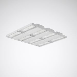 Robuster LED-Hallenstrahler. Geeignet zur Anwendung in HACCP, IFS und/oder BRC Global Standard Food zertifizierten Unternehmen. Mit begrenzter Oberflächentemperatur, für den Einsatz in feuergefährdeten Räumen gemäß DIN EN 60598-2-24 geeignet. Zur Deckenmontage sowie abgehängten Montage über optionales Zubehör geeignet. Optisches System aus einer PC-Linsenoptik zusammengesetzt. Mit symmetrisch eng strahlender Lichtstärkeverteilung. Leuchtenlichtstrom und Lichtfarbe fest eingestellt. LED-System bestehend aus 8 LED-Modulen, auf Aluminiumträger montiert. Bemessungslichtstrom 71600 lm, Bemessungsleistung 401 W, maximale Leuchten-Lichtausbeute 179 lm/W. Lichtfarbe neutralweiß, ähnlichste Farbtemperatur (CCT) 4000 K, allgemeiner Farbwiedergabeindex (CRI) Ra > 80. Farborttoleranz (initial MacAdam) = 3 SDCM. Mittlere Bemessungslebensdauer L80 (tq 45 °C) = 100.000 h., Mittlere Bemessungslebensdauer L90 (tq 45 °C) = 50.000 h. Flimmern: Pst LM = 1,0 bei Volllast. Stroboskop-Effekt: SVM = 0,4 bei Volllast. Robuster Aluminium-Druckguss-Körper mit integrierten Kühlrippen. Oberfläche weiß beschichtet (ähnlich RAL 9016). Maße (L x B): 649 mm x 775 mm, Leuchtenhöhe 63 mm. Schutzklasse (EN 61140): I, Schutzart (DIN EN 60529): IP65, Stoßfestigkeitsgrad nach IEC 62262: IK08, Prüftemperatur Glühdrahttest gemäß IEC 60695-2-11: 850 °C. Zulässige Umgebungstemperatur (ta): -30 °C bis 45 °C. Gewicht: 16,8 kg. Mit 5-poliger Anschlussleitung 5 x 0,75 mm2 (1500 mm). Mit 3 elektronischen Betriebsgeräten, digital dimmbar (DALI). Betriebsgerät gemäß DALI-2-Standard (EN 62386). Leuchte mittels Tastfunktion über DALI-Steuerklemmen schalt- und dimmbar (Touch DIM). Das Betriebsgerät ist entsprechend der Ökodesign-Anforderungen (VO (EU) 2019/2020) austauschbar. Die Leuchte ist Monitoring ready (MOR) und liefert Leuchtendaten zur Überwachung oder vorausschauenden Wartung. Sie ist damit kompatibel zu den TRILUX Monitoring Services. Das Produkt erfüllt die grundlegenden Anforderungen der anwendbaren EU-Richtlinien und des Produktsicherheitsgesetzes und trägt die CE-Kennzeichnung. Zusätzlich ist die Leuchte durch eine unabhängige Prüfstelle ENEC-zertifiziert. Leuchte 10 Jahre, Ersatzteil Betriebsgerät 15 Jahre nach Rechnungsdatum unter Vorbehalt vertretbarer Änderungen, die dem Fortschritt dienen, verfügbar. Ersatzteile LED-Modul und optisches System sind bauartbedingt nicht verfügbar.