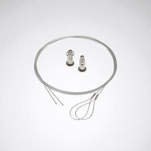 Seilabhängung für Leuchten der Baureihe Tugra. Mit Schlaufe zur Deckenabhängung. Mit Gewindehülse zur Befestigung an der Montageklammer. Für Abhängelängen bis 2000 mm. Verpackungseinheit 2 Stück, für zwei Abhängepunkte.