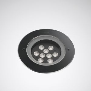 Bodeneinbaustrahler für Akzentbeleuchtung, begeh- und überrollbar. Für den Bodeneinbau. Bauseits ist ein der Belastung entsprechendes Fundament mit ausreichender Drainage vorzusehen. Mit rotationssymmetrisch breit strahlender Lichtstärkeverteilung. Optisches System um ±15° schwenkbar. Ausstrahlungswinkel 50°. Leuchtenlichtstrom und Lichtfarbe fest eingestellt. LED-System mit 9 LED. Bemessungslichtstrom 1200 lm, Bemessungsleistung 16 W, maximale Leuchten-Lichtausbeute 75 lm/W. Lichtfarbe warmweiß, ähnlichste Farbtemperatur (CCT) 3000 K, allgemeiner Farbwiedergabeindex (CRI) Ra > 80. Farborttoleranz (initial MacAdam) = 3 SDCM. Mittlere Bemessungslebensdauer L80 (tq 25 °C) = 50.000 h. Flimmern: Pst LM = 1,0 bei Volllast. Strahlergehäuse aus Aluminium-Druckguss. Farbe schwarz (ähnlich RAL 9005). Abschlussring mit Verschlussschrauben und Gewindeeinsätzen aus Edelstahl dauerhaft befestigt. Abschlussscheibe aus 15 mm dickem, gehärtetem Glas, klar. In Schrittgeschwindigkeit überrollbar bis 2000 kg. Schutzklasse (EN 61140): I, Schutzart (DIN EN 60529): IP68, Stoßfestigkeitsgrad nach IEC 62262: IK10. Zulässige Umgebungstemperatur (ta): 25 °C Gewicht: 3,8 kg. Anschlussfertig verdrahtet. Mit nach außen geführter Anschlussleitung, schutzartgerecht verschlossen. Innen liegender Anschlussraum durch Epoxyd-Kunstharz versiegelt. Die Leuchte ist für den Betrieb an einem 230V Gleichspannungsnetz (DC) geeignet. Mit elektronischem Betriebsgerät, schaltbar. Die Leuchte ist für den Betrieb an einem 230V Gleichspannungsnetz (DC) geeignet. Stoßspannungsfestigkeit Differential Mode / Common Mode: 2 kV / 1 kV. Das Produkt erfüllt die grundlegenden Anforderungen der anwendbaren EU-Richtlinien und des Produktsicherheitsgesetzes und trägt die CE-Kennzeichnung.