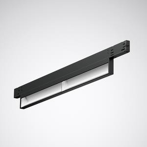 Stromschienen-Leuchte für 3-Phasen-Stromschiene. System Rail (Stucchi). Wallwasher für die Stromschiene zur besonders gleichmäßigen und klaren Ausleuchtung von Wänden, Grafiken und Abbildungen. Befestigung an 3-Phasen-Stromschiene gemäß DIN EN 60570 mittels integriertem 3-Phasen-Stromschienenadapter. Bei der Planung ist die Polarität des Nullleiters zu beachten. Lage der Polarität, siehe rote Markierung in der Maßskizze. Wallwasher mit asymmetrischer Lichtstärkeverteilung. Leuchtenlichtstrom und Lichtfarbe fest eingestellt. Bemessungslichtstrom 1000 lm, Bemessungsleistung 13 W, maximale Leuchten-Lichtausbeute 77 lm/W. Lichtfarbe neutralweiß, ähnlichste Farbtemperatur (CCT) 4000 K, allgemeiner Farbwiedergabeindex (CRI) Ra > 90. Farborttoleranz (initial MacAdam) = 3 SDCM. Mittlere Bemessungslebensdauer L80 (tq 25 °C) = 50.000 h. Flimmern: Pst LM = 1,0 bei Volllast. Stroboskop-Effekt: SVM = 0,4 bei Volllast. Leuchtenkörper feinstruktur-pulverbeschichtet. Aus Aluminium. Oberfläche schwarz beschichtet (ähnlich RAL 9005). Leuchtenmaße (L x B x H): 630 mm x 14 mm x 70 mm. Schutzklasse (EN 61140): II, Schutzart (DIN EN 60529): IP20, Stoßfestigkeitsgrad nach IEC 62262: IK02, Prüftemperatur Glühdrahttest gemäß IEC 60695-2-11: 650 °C. Zulässige Umgebungstemperatur (ta): 25 °C Gewicht: 0,5 kg. Mit elektronischem Betriebsgerät, digital dimmbar (DALI). Betriebsgerät gemäß DALI-2-Standard (EN 62386). Das Produkt erfüllt die grundlegenden Anforderungen der anwendbaren EU-Richtlinien und des Produktsicherheitsgesetzes und trägt die CE-Kennzeichnung.