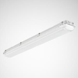 LED-Feuchtraum-Anbauleuchte IP66 mit PC-Leuchtenkörper und PC-Diffusor. Mit begrenzter Oberflächentemperatur, für den Einsatz in feuergefährdeten Räumen gemäß DIN EN 60598-2-24 geeignet. Mit Cliplos-Verschlusstechnik zur schutzartgerechten, einfachen Montage von Diffusor-Abdeckwanne und Leuchtenkörper nach dem Anschluss. Für Decken- und Wand- sowie abgehängte Montage. Deckenmontage über beiliegende Befestigungsklammer. Abgehängte Montage über optionales Zubehör möglich. Abdeckwanne aus opalem, transluzenten PC mit innen liegender Prismenstruktur. Mit lambertscher Lichtstärkeverteilung. Leuchtenlichtstrom und Lichtfarbe fest eingestellt. Bemessungslichtstrom 17000 lm, Bemessungsleistung 109 W, maximale Leuchten-Lichtausbeute 156 lm/W. Lichtfarbe neutralweiß, ähnlichste Farbtemperatur (CCT) 4000 K, allgemeiner Farbwiedergabeindex (CRI) Ra > 80. Farborttoleranz (initial MacAdam) = 3 SDCM. Mittlere Bemessungslebensdauer L80 (tq 25 °C) = 50.000 h. Die Lichtquelle ist entsprechend der Ökodesign-Anforderungen (VO (EU) 2019/2020) austauschbar. Flimmern: Pst LM = 1,0 bei Volllast. Stroboskop-Effekt: SVM = 0,4 bei Volllast. Leuchtenkörper aus recycelbarem, UV-beständigem PC. Breite Bauform für hohe Lichtströme und verbesserte Thermik innerhalb des Gehäuses. Oberfläche lichtgrau beschichtet (ähnlich RAL 7035). Mit Cliplos-Verschlusstechnik zur schutzartgerechten, einfachen Montage von Diffusor-Abdeckwanne und Leuchtenkörper nach dem Anschluss. Maße (L x B): 1578 mm x 145 mm, Leuchtenhöhe 101 mm. Schutzklasse (EN 61140): I, Schutzart (DIN EN 60529): IP66, Stoßfestigkeitsgrad nach IEC 62262: IK08, Prüftemperatur Glühdrahttest gemäß IEC 60695-2-11: 850 °C. Zulässige Umgebungstemperatur (ta): -25 °C bis 35 °C. Gewicht: 3,3 kg. Mit 3-poliger Anschlussklemme bis 2,5 mm2. Mit elektronischem Betriebsgerät, schaltbar. Das Betriebsgerät ist entsprechend der Ökodesign-Anforderungen (VO (EU) 2019/2020) austauschbar. Das Produkt erfüllt die grundlegenden Anforderungen der anwendbaren EU-Richtlinien und des Produktsicherheitsgesetzes und trägt die CE-Kennzeichnung.