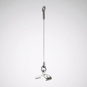 Seilabhängung mit Befestigungsklammer. Für Abhängelängen bis 1500 mm. Bestehend aus 1 Stahlseil, verzinkt, ø 1,5 mm und Aufhängeklammer aus Edelstahl. Seillänge stufen- und werkzeuglos verstellbar.