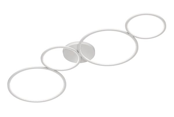 vier aneinander hängenden Ringen unterschiedlichen Durchmessers, verfügt über einen integrierten Dimmer, der über den Lichtschalter gesteuert wird, Farbgestaltung in Weiß matt