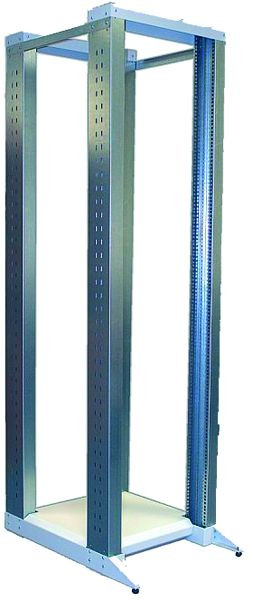 Das Bodenteil der zweiteiligen Gestellrahmen bildet ein geschweißter Rahmen aus lackiertem Stahlblech. An diesem sind die verzinkten vertikalen 19“-Profilschienen befestigt, die im oberen Teil des Rahmens durch eine Strebe in derselben Farbe wie das Bodenteil versteift werden. Im Beipack des Gestellrahmens befinden sich Stellfüße. An ihrer Stelle können auch Rollen zur einfacheren Bewegung des Gestellrahmens montiert werden. Maximal Belastung 400 KG