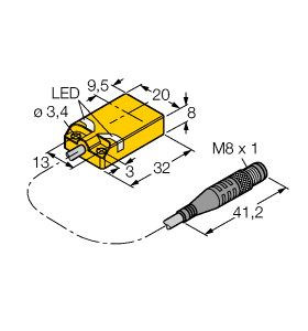 Induktiver Sensor, quaderförmig, Höhe 8 mm, aktive Flaeche oben, Kunststoff, PP, DC 3-Draht, 10...30 VDC, Schliesser, PNP-Ausgang, Pigtail mit M8 x 1 Steckverbinder, Kabellaenge 0.3? m, Faktor 1 fuer alle Metalle, erhöhter Schaltabstand, magnetfeldfest, direkt auf Metall aufbaubar, Bemessungsschaltabstand: 10 mm, nicht buendig