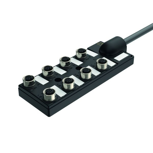 Passiver Aktuator-/Sensor-Verteiler M12 x 1, 8-fach, mit fest angeschlossener Leitung, Bemessungsspannung 30 V, Leitungslänge2 m, Gehäusematerial: Nylon, Gehäusefarbe: schwarz, Schutzart IP67, RoHS-konform, CE-konform, LED (PNP-Schaltung), E/A-Steckplatz (Polzahl): 3-polig + PE
