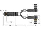 Zweifachverteiler, Y-Verteiler mit Leitung, Kupplung M12x1 - 2x Stecker M12x1, Bemessungsspannung 48 V, Leitungslänge0,6 m, Mantelmaterial: PUR, Mantelfarbe: schwarz, Schleppkettentauglich, Chemikalien-, UV- und ölbeständig, Flammwidrig (FT2 gemäß UL 1581, IEC 60332-2-2), Halogen-, silikon-, PVC- und LABS-frei, Besonders abriebfest, RoHS-konform, Schutzart: IP67, 4/3-polig, Leitungslänge: 0.6 / 0.6 Meter