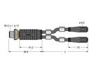 Zweifachverteiler, Y-Verteiler mit Leitung, Stecker M12x1 - 2x Kupplung Ø8mm, Bemessungsspannung 60 V, Leitungslänge0,3 m, Mantelmaterial: PVC, Mantelfarbe: schwarz, Chemikalien- und ölbeständig, Flammwidrig, Beständig gegen Säuren und Laugen, Mikroben- und hydrolysefest, LABS-frei, RoHS-konform, Schutzart IP67, 4/3-polig, Leitungslänge: 0.3 / 0.3 Meter