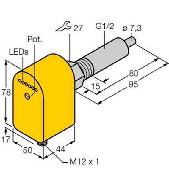 Strömungsüberwachung, Eintauchsensor mit integrierter Auswerteelektronik, Einbaubedingungen Eintauchsensor, Sensor für flüssige Medien, kalorimetrische Funktionsweise, Abgleich über Potenziometer, Anzeige via LED-Kette, Sensorlänge 80 mm, DC 3-Draht, 19,2...28,8 VDC, Schließer, PNP-Ausgang, Steckergerät, M12 x 1