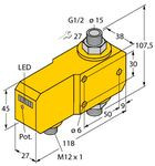 Strömungsüberwachung, Inline-Sensor mit integrierter Auswerteelektronik, Einbaubedingungen Inline-Sensor, Sensor für flüssige Medien, Kalorimetrische Funktionsweise, Abgleich über Potentiometer, Anzeige via LED-Kette, Arbeitsbereich 3...20 l/min, DC 4-Draht, 21.6...26.4 VDC, Schließer, Relaisausgang, Steckergerät, M12 x 1