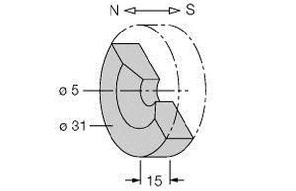 Zubehör, Dauermagnet, 90 mm erreichbarer Schaltabstand bei Magnetfeldsensoren (BIM) der Bauform (E)M12E, M18 und G12SK, 78 mm erreichbarer Schaltabstand bei Magnetfeldsensoren (BIM) der Bauform EH6.5, EG08 und M12-S1209 , Remanenz (Br) 380-400 mT (3800-4000 Gauss), Werkstoff: Strontium-Ferrit (SrFe)