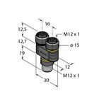 | Kurzbeschreibung | Zweifachverteiler, Y-Verteiler ohne Leitung, Stecker M12x1 - 2x Kupplung M12x1, Bemessungsspannung 60 V, M12-Stecker, 5-polig , M12-Kupplung, 4-polig |