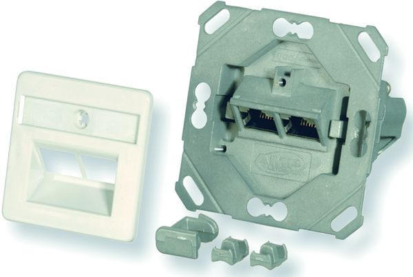 DIN Doppeldose AMP-TWIST-6S, Cat. 6 Pyramid Tested, Floor Version ist geringe Einbautiefe zur problemlosen Bodentankmontage, 50x50mm Zentralplatte mit unverlierbarer Befestigungsschraube, unverlierbare, verdrehsichere Zugentlastung und Schirmauflage, Kabeleinführung zur Vermeidung von Knicken um 15° geneigt, LSA+ werkzeugkompatibel, geschützte Leiterplatte, Farbcodierung nach T568A und T568B