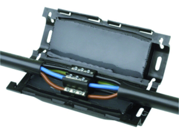 RayGel Verbindungs- und Abzweigmuffe (0,6/1 kV), umweltfreundlich (Verwendung von umweltbewußten, leicht zu entsorgenden Materialien), wenige Komponenten, schnelle und einfache Montage, keine Spezialwerkzeuge nötig, kein Zurechtsägen, Mischen und Befüllen, keine Flamme, keine Bänder, halogenfrei, sofortiges Zuschalten möglich und für Prüfzwecke wieder zu öffnen, geprüft nach CENELEC HD 623, klappbares, mechanisch robustes Gehäuse, gefüllt mit PowerGel, verschiedene Verbindertypen einsetzbar