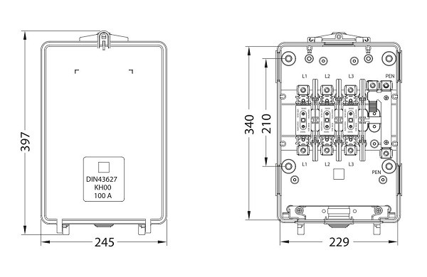 Kabelhausanschlusskasten 1 x 3 x NH00 bis 100 A, Typ KH00-A nach DIN 4362, Bestell-Nr.: 2751016, Gehäuse-Unterteil und Deckel aus Polyesterharz - Formmasse Typ 803, DIN16911, Schutzart IP 54 nach EN 60529, plombierbare Verschlussschraube mit 8 mm Außenvierkant und Schlitz, steckbare Phasentrennwände aus PA, innenliegende Wandbefestigung mit Abdeckkappen oder wahlweise, Außenbefestigung (Zubehör) möglich, plombierbare Primärklemmenabdeckung (EVU-Abdeckung), während der Kabelmontage im Abgang zu benutzen; kann nach Gebrauch im Deckel deponiert werden, Kabelzugang: Kabeleinführung über steckbaren Einschub mit abgestufter Dichtung bis Ø42 unten mittig, Kabelbefestigung mit Zugentlastungsschelle, Seitliche Kabelzugänge und rückwärtiger Kabelzugang möglich Kabelabgang: Kabelabgang (Ø16 bis 42 mm) über steckbaren Einschub mit Würgenippel und Pg36-Gewinde, oben mittig oder wahlweise seitlich durch um stecken der Einschübe, Würgenippel Pg16 oben rechts, Einbauten: NH00-Kontakte (versilbert) auf Kunststoffsockel, Zugang: Stahlrahmenklemmen, Abgang: Stahlrahmenklemmen, PEN-Schiene: Zugang: 1 Stahlrahmenklemme /Abgang: 3 Stahlrahmenklemmen(10-70 rm/sm/10-95 re/se)