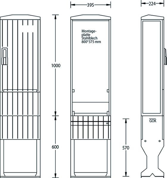 Verteilerschrank für Freiluftaufstellung mit Sockel, Schwenkhebel mit Einfachschließung Profilhalzylinder 40 mm, Baukastensystem mit auswechselbaren Einzelteilen, Tür und Rückwand mit profilierter Oberfläche, Kabelabfangschiene, eine Montageplatte aus Stahlblech, Eingrabtiefe: 550 mm