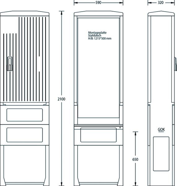 für Freiluftaufstellung mit durchgehendem Seitenteil, Schwenkhebel mit Einfachschließung, Profilhalbzylinder 40 mm, Baukastensystem mit auswechselbaren Einzelteilen, Tür und Rückwand mit profilierter Oberfläche, Kabelabfangschiene, mit Montageplatte aus Stahlblech, Eingrabtiefe: 650 mm