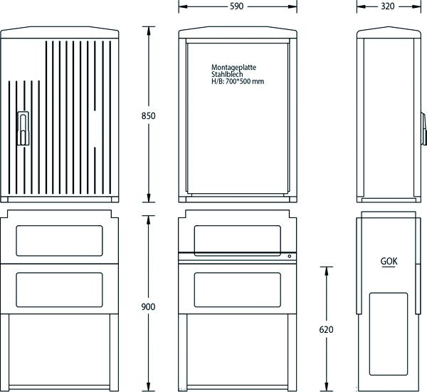 für Freiluftaufstellung mit Sockel, Schwenkhebel mit Einfachschließung, Profilhalbzylinder 40 mm, Baukastensystem mit auswechselbaren Einzelteilen, Tür und Rückwand mit profilierter Oberfläche, Kabelabfangschiene, eine Montageplatte aus Stahlblech, Eingrabtiefe: 600 mm