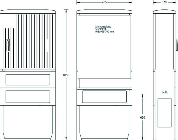 für Freiluftaufstellung mit durchgehendem Seitenteil, Schwenkhebel mit Einfachschließung, Profilhalbzylinder 40 mm, Baukastensystem mit auswechselbaren Einzelteilen, Tür und Rückwand mit profilierter Oberfläche, Kabelabfangschiene, mit Montageplatte aus Stahlblech, Eingrabtiefe: 650 mm
