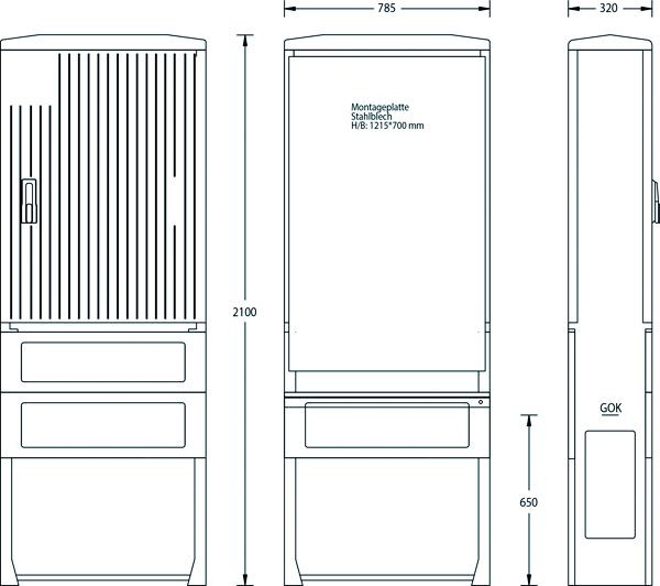 für Freiluftaufstellung mit durchgehendem Seitenteil, Schwenkhebel mit Einfachschließung, Profilhalbzylinder 40 mm, Baukastensystem mit auswechselbaren Einzelteilen, Tür und Rückwand mit profilierter Oberfläche, Kabelabfangschiene, mit Montageplatte aus Stahlblech, Eingrabtiefe: 650 mm