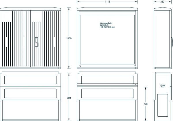 für Freiluftaufstellung mit Sockel, Schwenkhebel mit Einfachschließung, Profilhalbzylinder 40 mm, Baukastensystem mit auswechselbaren Einzelteilen, Tür und Rückwand mit profilierter Oberfläche, Kabelabfangschiene, eine Montageplatte aus Stahlblech, Eingrabtiefe: 600 mm