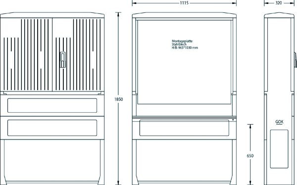 für Freiluftaufstellung mit durchgehendem Seitenteil, Schwenkhebel mit Einfachschließung, Profilhalbzylinder 40 mm, Baukastensystem mit auswechselbaren Einzelteilen, Tür und Rückwand mit profilierter Oberfläche, Kabelabfangschiene, mit Montageplatte aus Stahlblech, Eingrabtiefe: 650 mm