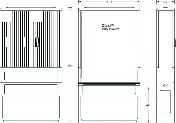 für Freiluftaufstellung mit durchgehendem Seitenteil, Schwenkhebel mit Einfachschließung, Profilhalbzylinder 40 mm, Baukastensystem mit auswechselbaren Einzelteilen, Tür und Rückwand mit profilierter Oberfläche, Kabelabfangschiene, mit Montageplatte aus Stahlblech, Eingrabtiefe: 650 mm
