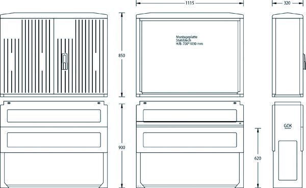 für Freiluftaufstellung mit Sockel, Schwenkhebel mit Einfachschließung, Profilhalbzylinder 40 mm, Baukastensystem mit auswechselbaren Einzelteilen, Tür und Rückwand mit profilierter Oberfläche, Kabelabfangschiene, eine Montageplatte aus Stahlblech, Eingrabtiefe: 600 mm