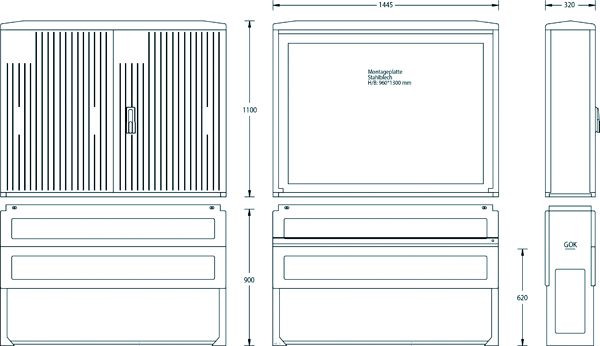 für Freiluftaufstellung mit Sockel, Schwenkhebel mit Einfachschließung, Profilhalbzylinder 40 mm, Baukastensystem mit auswechselbaren Einzelteilen, Tür und Rückwand mit profilierter Oberfläche, Kabelabfangschiene, eine Montageplatte aus Stahlblech, Eingrabtiefe: 600 mm