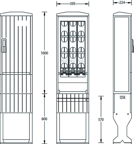 bestückt mit 3-9 Sicherungsleisten NH2 mit Montageplatte, Vorder- und Rückwand profiliert, Stecktüre mit Schwenkhebelgriff und 3-Punkt-Verriegelung, Schutzart: IP44, lichtgrau, RAL 7035