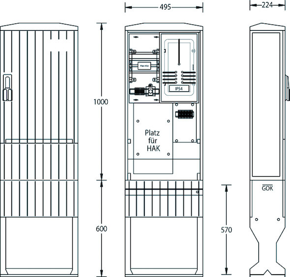 Flachschrank Größe 0 / A070-1000, Schutzklasse II, mit Doppelschließung inkl. 1 Profilhalbzylinder 40 mm, Platz für Hausanschlusskasten NH00, 1 Zählerplatz nach DIN 43 870 mit Klappfenster IP54, 1 Platz für Hauptsicherungsautomat Typ ABB-S750, GE/AEG-S91.3, HAGER-HTS auf SS-System 4-polig /12x5 mm Cu, 1 Steuersicherung D01/ 1-polig 10 A und Steuerklemme für SDE ("Huckepack" auf Zähler montiert) mit Plombierhaube, 1 Abgang mit Hauptleiterabzweigklemme 1,5 - 25 mm2, 5-polig, Eingrabtiefe: 600 mm, VNB-Rücksprache erforderlich