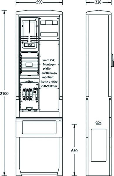 Säule Größe 0, A070-1850, Schutzart IP44, Schutzart II, mit Doppelschließung für Profihalbzylinder 40 oder 45 mm, Hausanschlusskasten NH00, 1 Zählerplatz IP54 nach DIN 43870, 1 Platz für Hauptsicherungsautomaten Typ ABB-S750, GE/AEG-S91.3, HAGER-HTS oder ABB-S700 auf SS-System 4-polig/12x5 mm Cu, 1 Abgang mit Hauptleiterabzweigklemme 1,5-25 mm2, 4-polig, 1 Montageplatte aus 5 mm PVC 250x1020 mm Größe 0, A070-2100, Schutzklasse II, mit Doppelschließung inkl. 1 Profilhalbzylinder 40 mm, Hausanschlusskasten NH00, 1 Zählerplatz IP54 nach DIN 43 870 mit Klappfenster, 1 Platz für Hauptsicherungsautomat Typ ABB-S750, GE/AEG-S91.3, HAGER-HTS auf SS-System 4 pol./ 12x5 mm Cu., 1 Abgang mit Klemmen 1,5 - 35 mm2, 5 pol., 1 Montageplatte aus 5 mm PVC, Eingrabtiefe: 650 mm