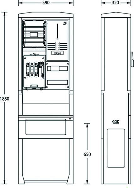 Größe 0 / A070-1850, Schutzklasse II, mit Doppelschließung inkl. Profilhalbzylinder 40 mm, Platz für Hausanschlusskasten NH00, 1 Zählerplatz IP54 nach DIN 43 870, Platz für Hauptsicherungsautomaten Typ ABB-S750, GE/AEG-S91.3, HAGER-HTS auf SS-System 5 pol./12x5 mm Cu., Steuersicherung D01/1 pol. 10 A und Steuerklemme für TSG ("Huckepack"- auf Zähler montiert) mit Plombierhaube, Leerfeld für Reiheneinbaugeräte 12 TE, Abgang mit Hauptleiterabzweigklemme 1,5 - 25 mm2, 5 pol., Eingrabtiefe: 650 mm