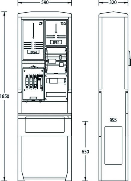 Größe 0 / A070-1850, 1 Abgang mit Hauptleiterabzweigklemme 1,5 - 25 mm2, 4 pol., Schutzklasse II, Hausanschlusskasten NH00, 1 Zählerplatz IP54 nach DIN 43 870, 1 TSG-Platz IP54 nach DIN 43 870, 1 LS-Schalter B10/1 pol. 25 kA und Steuerklemme für TSG mit Plombierhaube, 1 Platz für Hauptsicherungsautomaten Typ ABB-S750, GE/AEG-S91.3, HAGER-HTS auf SS-System 4 pol./12x5 mm Cu., Eingrabtiefe: 650 mm