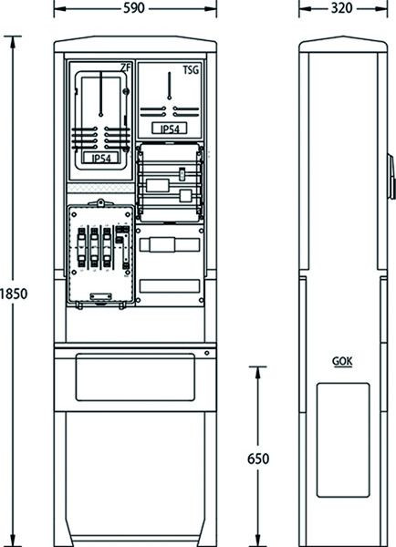 Säule Größe 0, A070-1850, Schutzart IP44, Schutzart II, mit Doppelschließung für Profihalbzylinder 40 oder 45 mm, Hausanschlusskasten NH00, 1 Zählerplatz und 1 TSG-Platz IP54 nach DIN 43870, 1 LS-Schalter B10/1-polig 25 kA und Steuerklemme für TSG mit Plombierhaube, 1 Platz für Hauptsicherungsautomaten Typ ABB-S750, GE/AEG-S91.3, HAGER-HTS oder ABB-S700 auf SS-System 4-polig/12x5 mm Cu, 1 Abgang mit Hauptleiterabzweigklemme 1,5-25 mm2, 4-polig A070-1850, 1 Abgang mit Hauptleiterabzweigklemme 1,5 - 35 mm2, 5 pol., Schutzklasse II, Hausanschlusskasten NH00, 1 Zählerplatz IP54 nach DIN 43 870 mit Klappfenster, 1 TSG-Platz IP54 nach DIN 43 870, 1 LS-Schalter B10/1 pol. 25 kA und Steuerklemme für TSG mit Plombierhaube, 1 Platz für Hauptsicherungsautomaten Typ ABB-S750, GE/AEG-S91.3, HAGER-HTS auf SS-System 4 pol./12x5 mm Cu., Eingrabtiefe: 650 mm