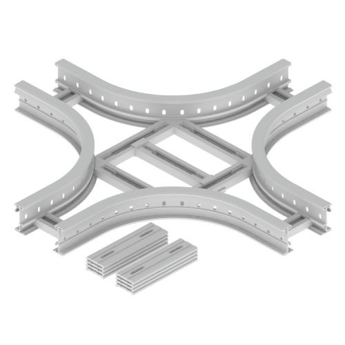 Element zur Ausführung von Kreuzungen zwischen zwei Kabelleiterabschnitten mit einem Krümmungsradius von 300 mm. Stoßstellenverbinder sind zur einfachen Montage im Lieferumfang enthalten. Isolierendes Material. Farbe: Lichtgrau RAL 7035