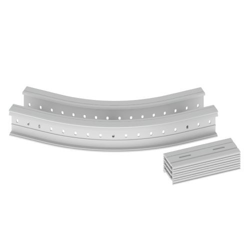 Flachbogen zur Ausführung von 45°-Drehungen. Es wird empfohlen, Träger unter den Bogen anzubringen. Krümmungsradius von 600 mm. Stoßstellenverbinder sind zur einfachen Montage im Lieferumfang enthalten. Isolierendes Material. Farbe: Lichtgrau RAL 7035