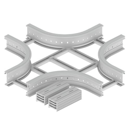Element zur Ausführung von Kreuzungen zwischen zwei Kabelleiterabschnitten mit einem Krümmungsradius von 300 mm. Stoßstellenverbinder sind zur einfachen Montage im Lieferumfang enthalten. Isolierendes Material. Farbe: Lichtgrau RAL 7035