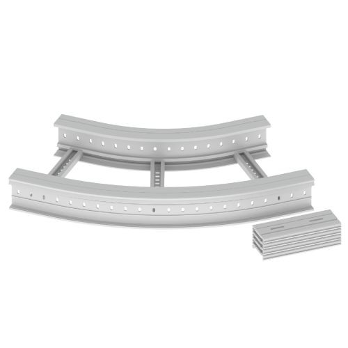 Flachbogen zur Ausführung von 45°-Drehungen. Es wird empfohlen, Träger unter den Bogen anzubringen. Krümmungsradius von 600 mm. Stoßstellenverbinder sind zur einfachen Montage im Lieferumfang enthalten. Isolierendes Material. Farbe: Lichtgrau RAL 7035